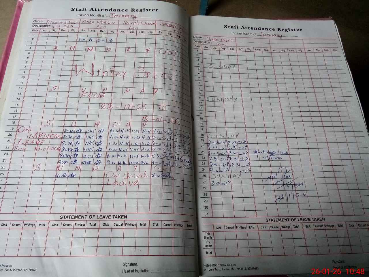 | Leave | Duty | Absent | Maternity | Medical | Ex- Pak |