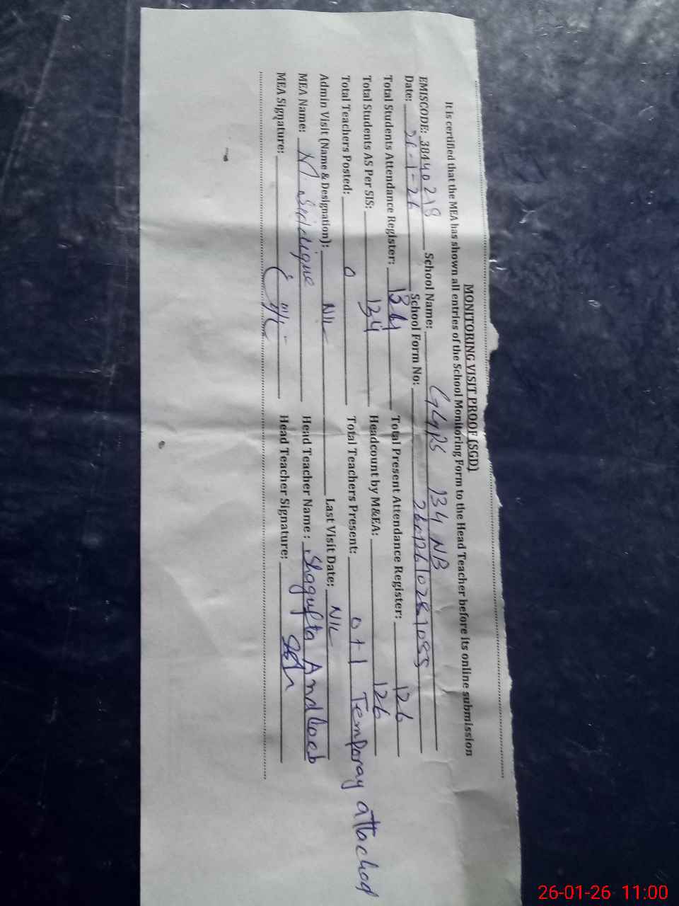 | Attendance Register | Head Teacher | MEA with School | Visit Proof |
