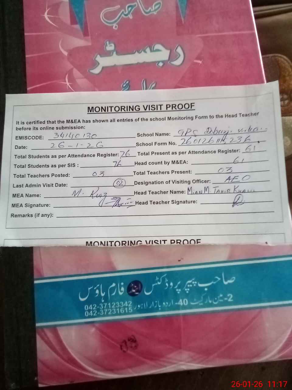 | Attendance Register | Head Teacher | MEA with School | Visit Proof |