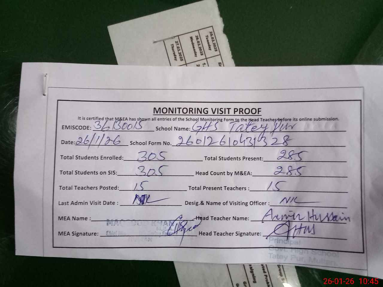 | Attendance Register | Head Teacher | MEA with School | Visit Proof |