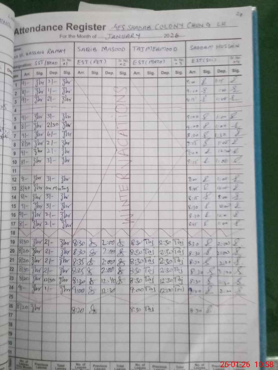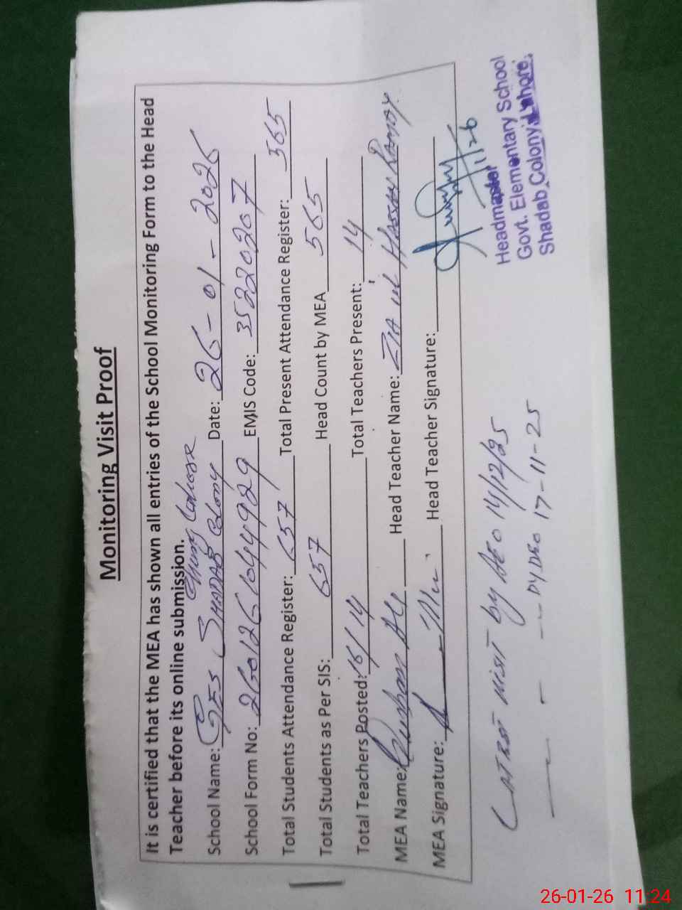 | Remarks (Use Separate Page if Required): Administrator visit of the AEO on 14th December 2025 Administrator visit of the Dy DEO on 17th November 2025 Ghulam Rasool MALI Performed the duty in the school Temporary Today present in the school. | |||||