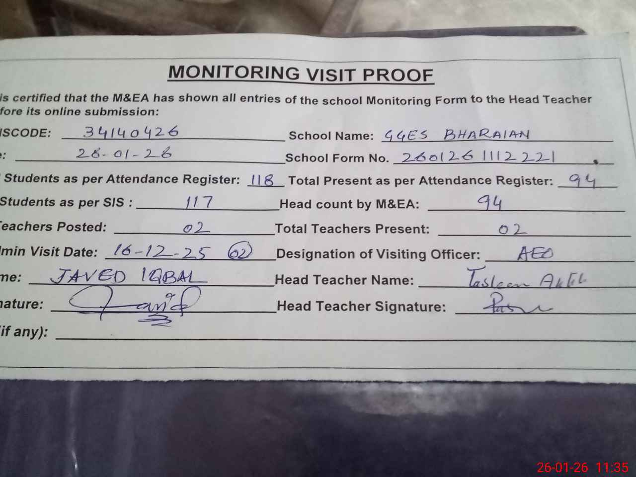 | Attendance Register | Head Teacher | MEA with School | Visit Proof |