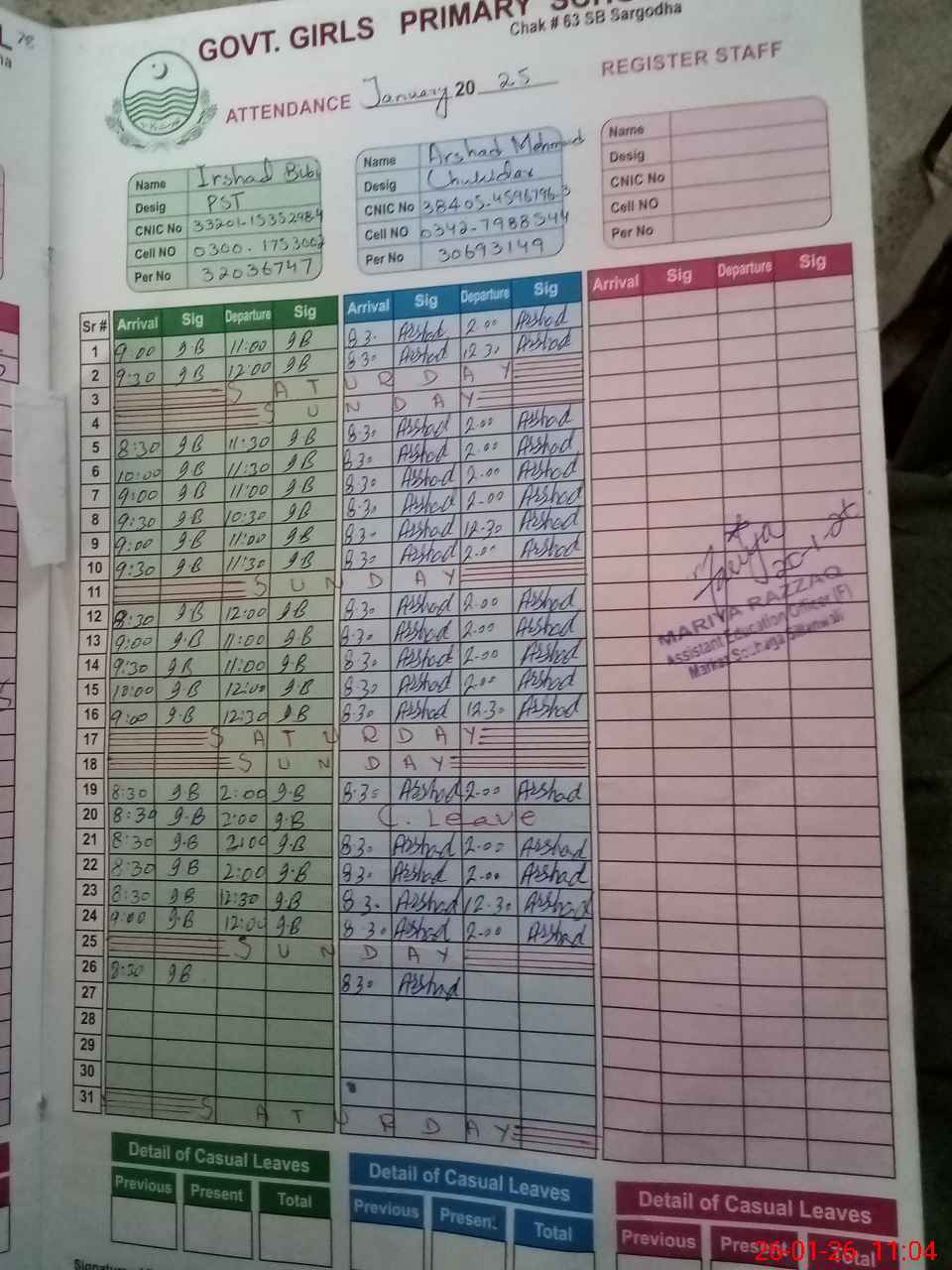 | CNIC | Full Name | Designation | R/C | Absence During Last Calender Month |