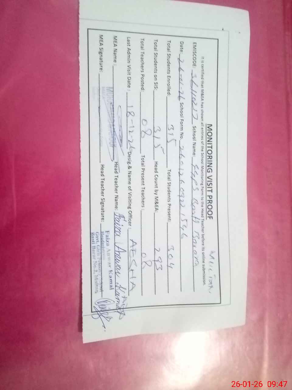 | Attendance Register | Head Teacher | MEA with School | Visit Proof |