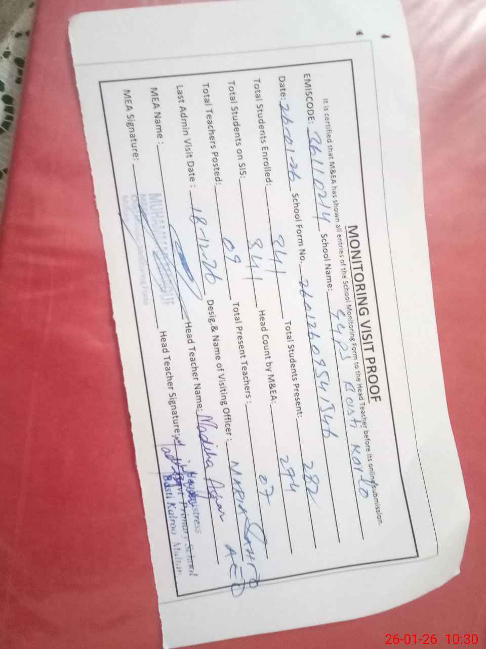 | Attendance Register | Head Teacher | MEA with School | Visit Proof |
