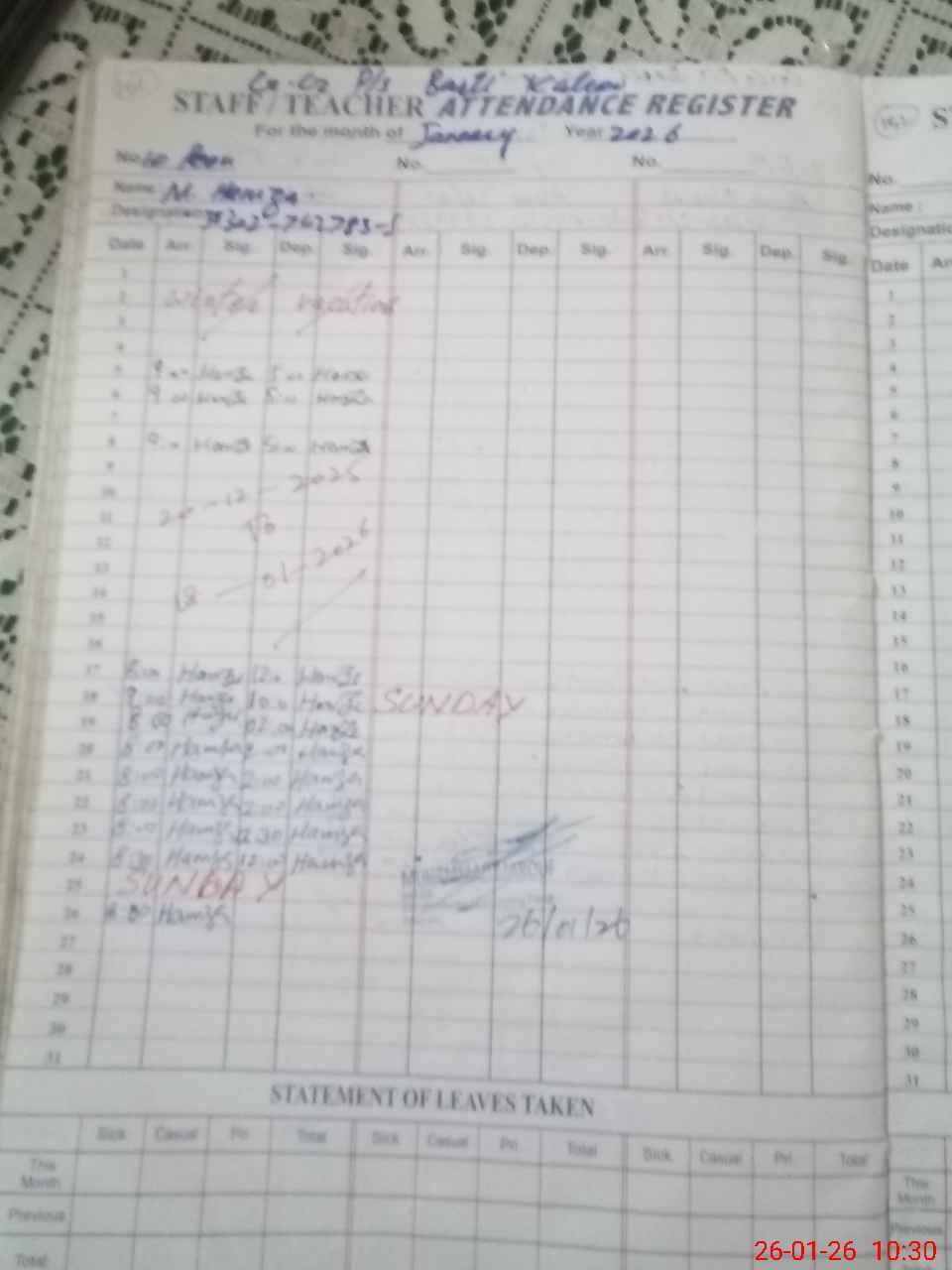 | 36**** | Wa**** Hi**** | PST Arts | Regular | 0 | 0 | 0 | 0 | 0 | 0 | 0 | 0 | 0 | Absent (Un-Authorized) |