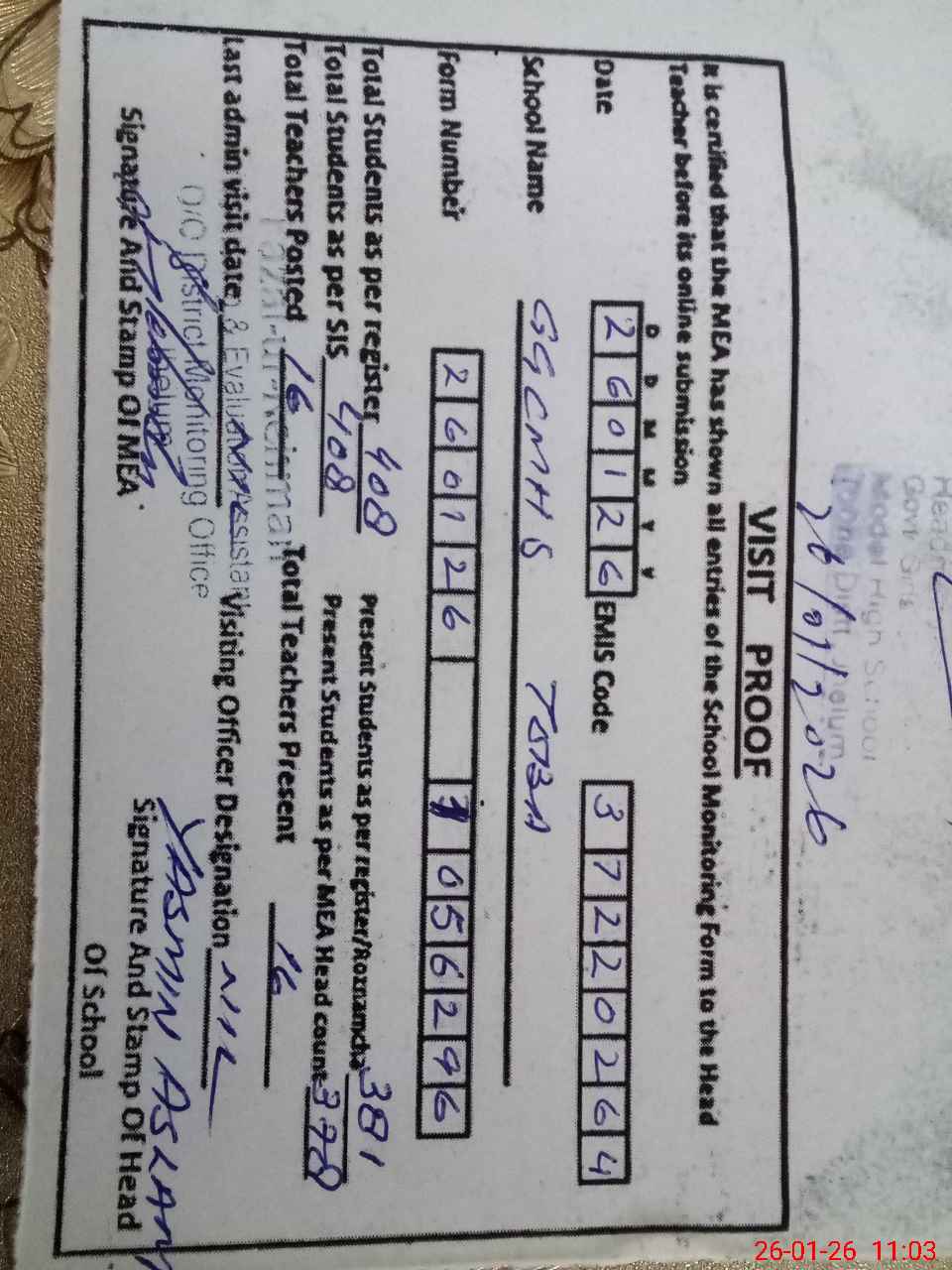 | Certified that this School was Inspected by the Undersigned MEA/DMO Today and the Information Stated Above is as Per Record. | |||||