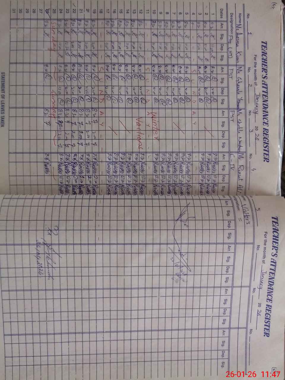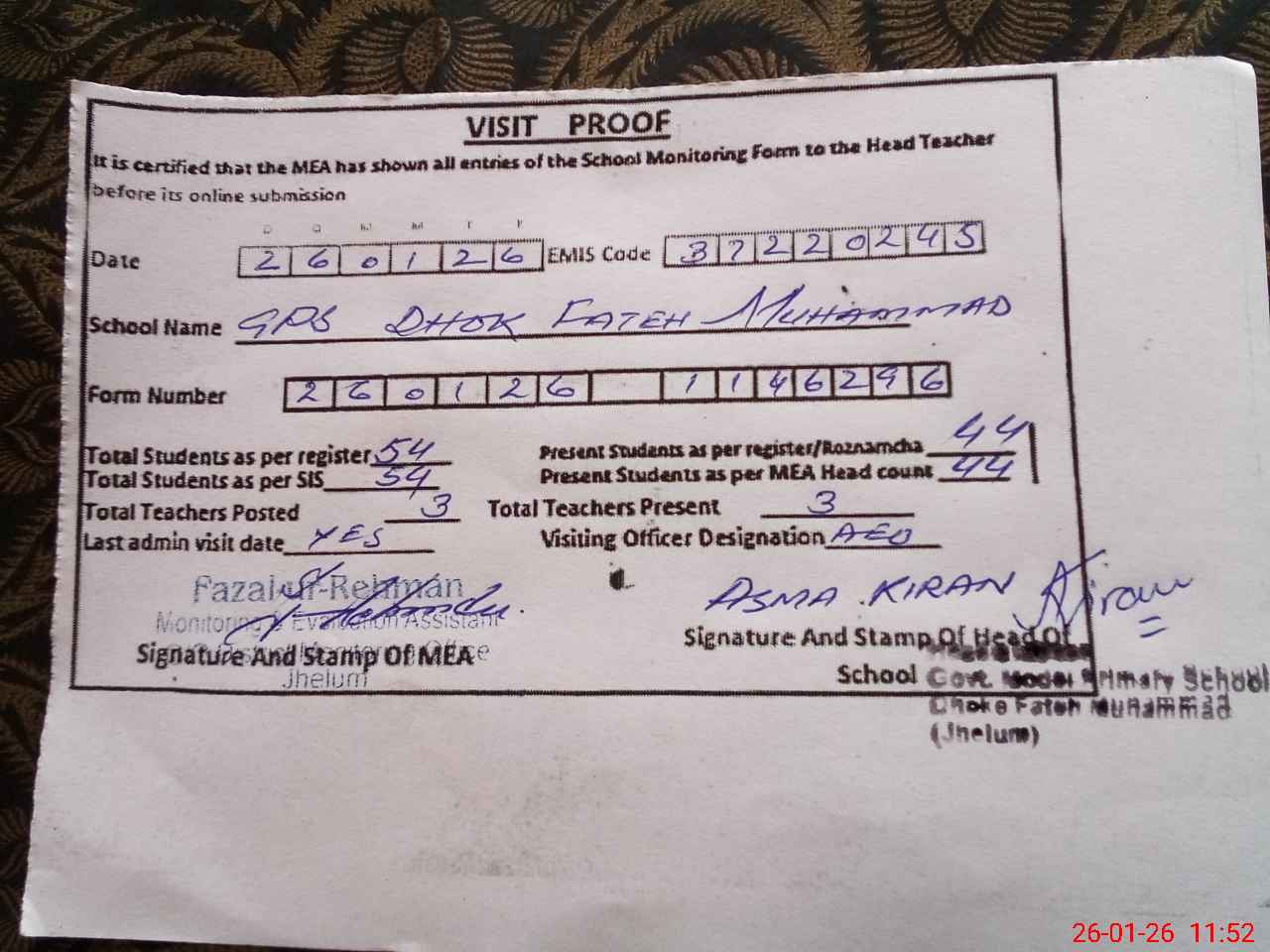 | Attendance Register | Head Teacher | MEA with School | Visit Proof |