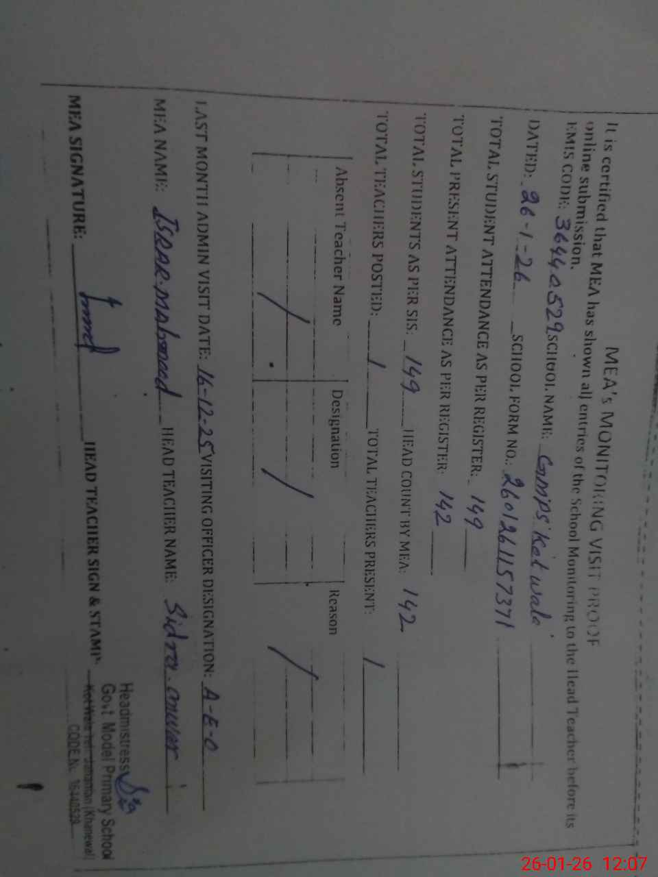| Attendance Register | Head Teacher | MEA with School | Visit Proof |