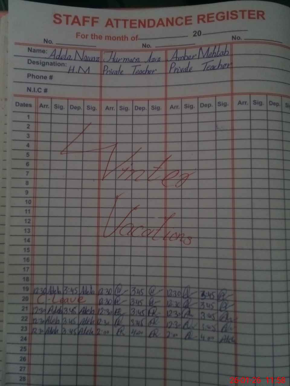 | CNIC | Full Name | Designation | R/C | Absence During Last Calender Month |
