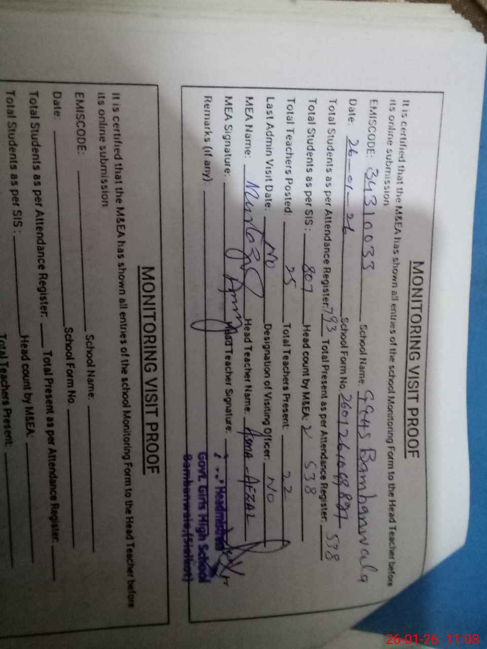 | EMIS Code: 34310033 | Name of School: GGHS BAMBAN WALA | |||