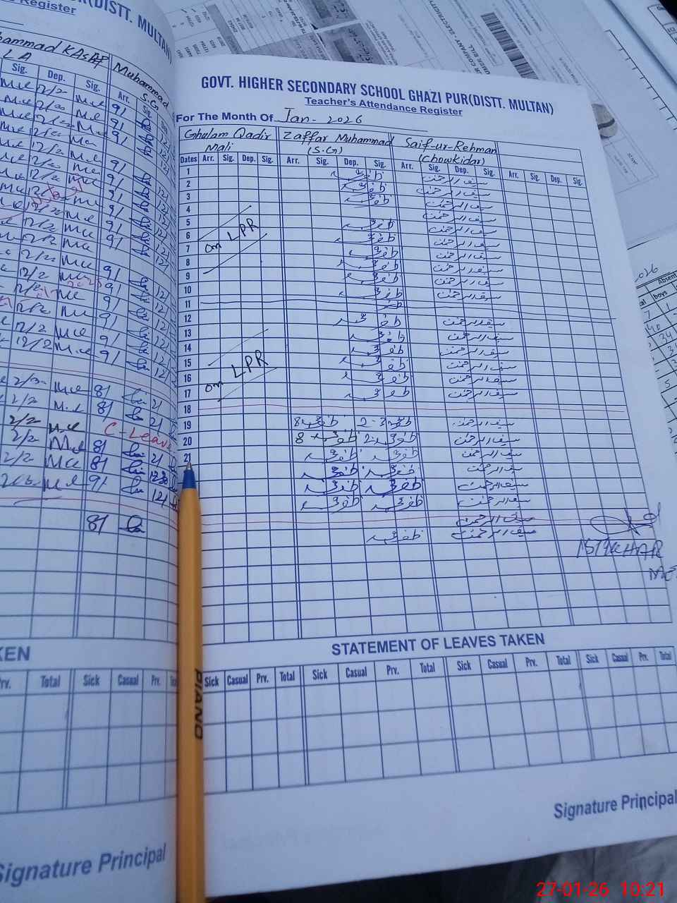 | CNIC | Full Name | Designation | R/C | Absence During Last Calender Month |