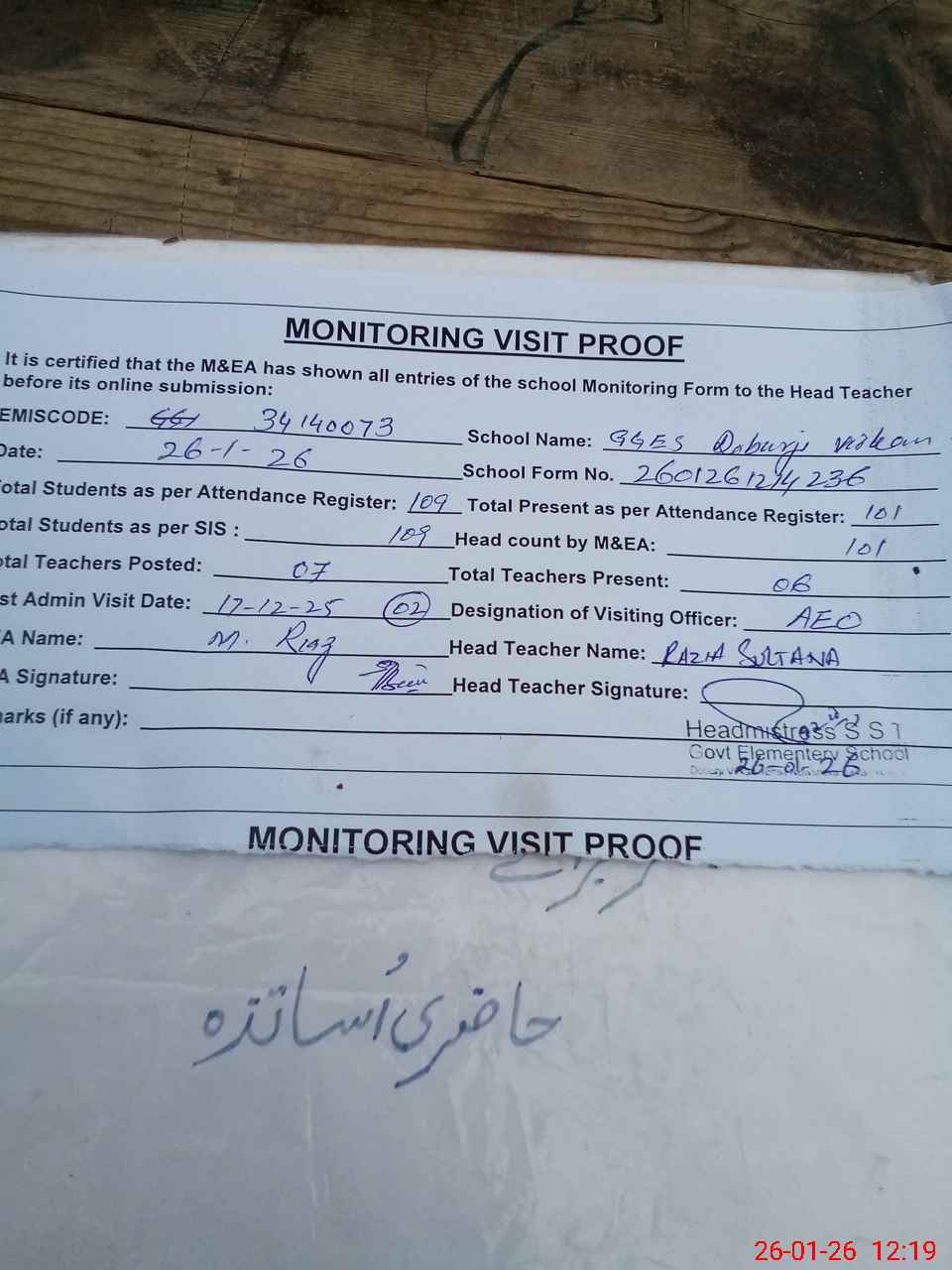 | Attendance Register | Head Teacher | MEA with School | Visit Proof |