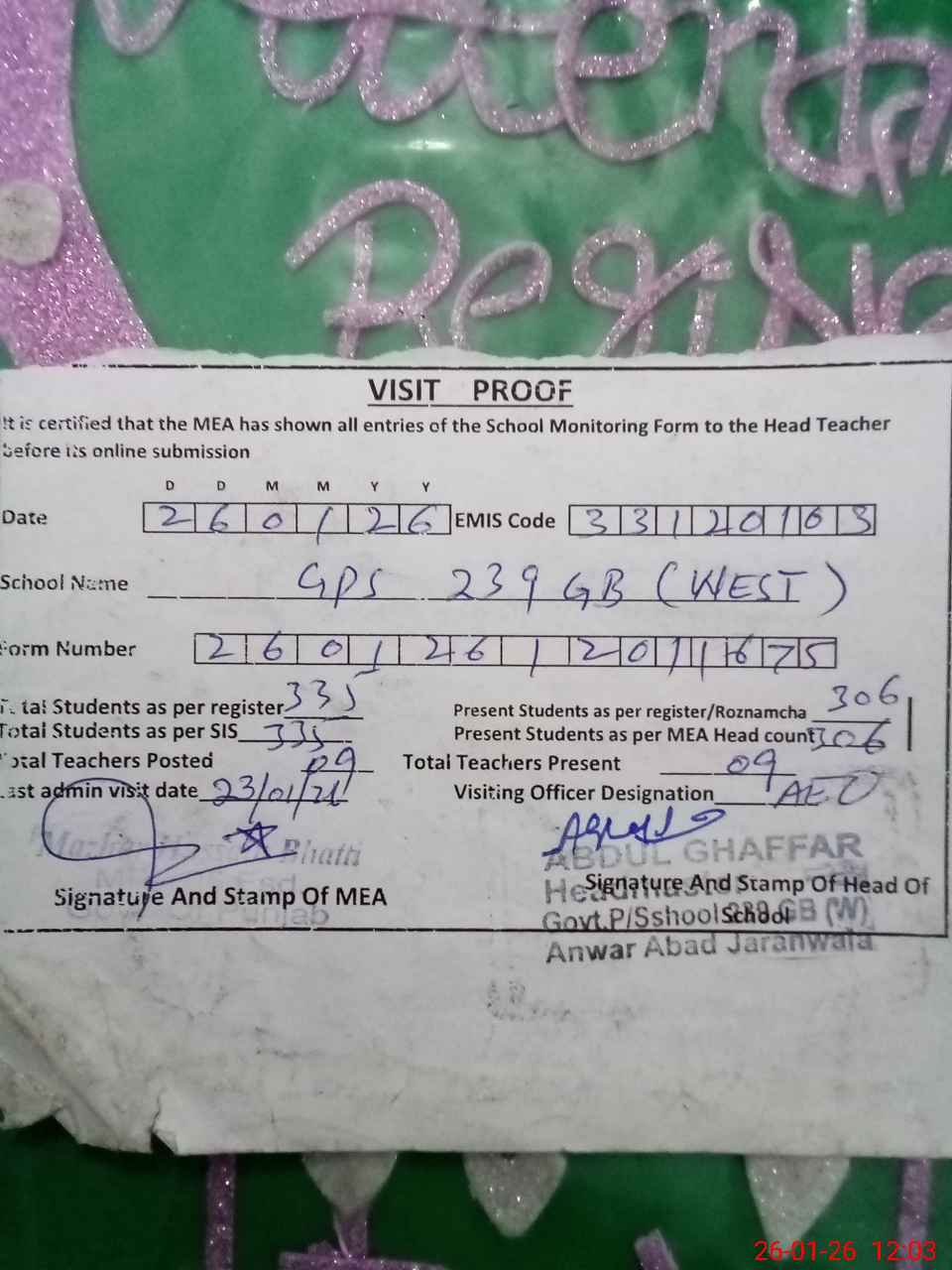 | Attendance Register | Head Teacher | MEA with School | Visit Proof |