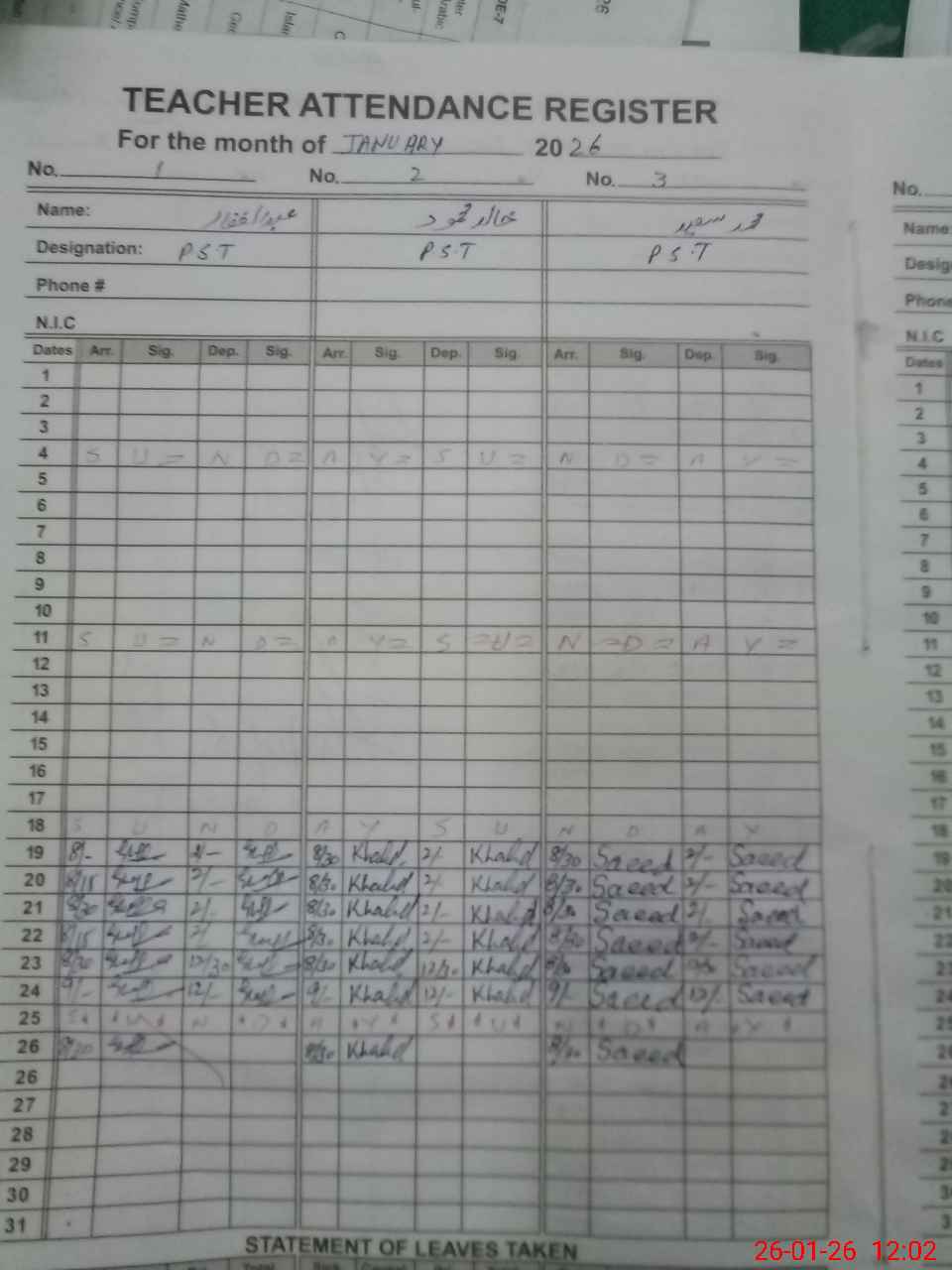 | CNIC | Full Name | Designation | R/C | Absence During Last Calender Month |
