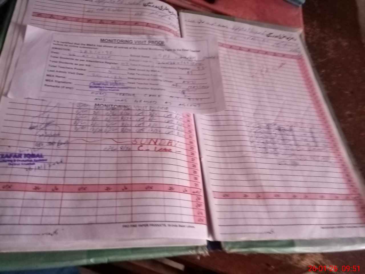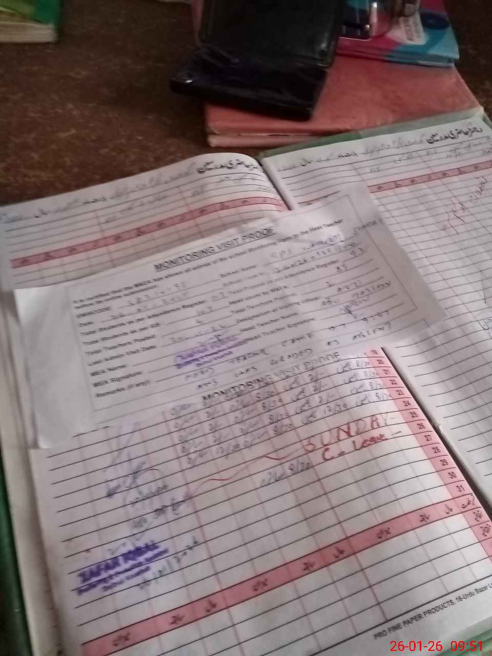 | Remarks (Use Separate Page if Required): total on sis 107 Total on register 107 last visit AEO 20 Jan 26 Head teacher was absent while visit and reached school at 9:47 | |||||
