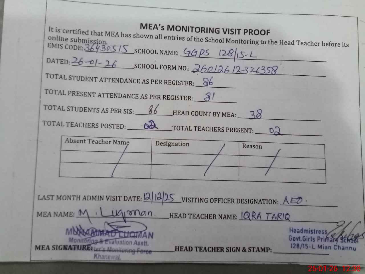 | Attendance Register | Head Teacher | MEA with School | Visit Proof |