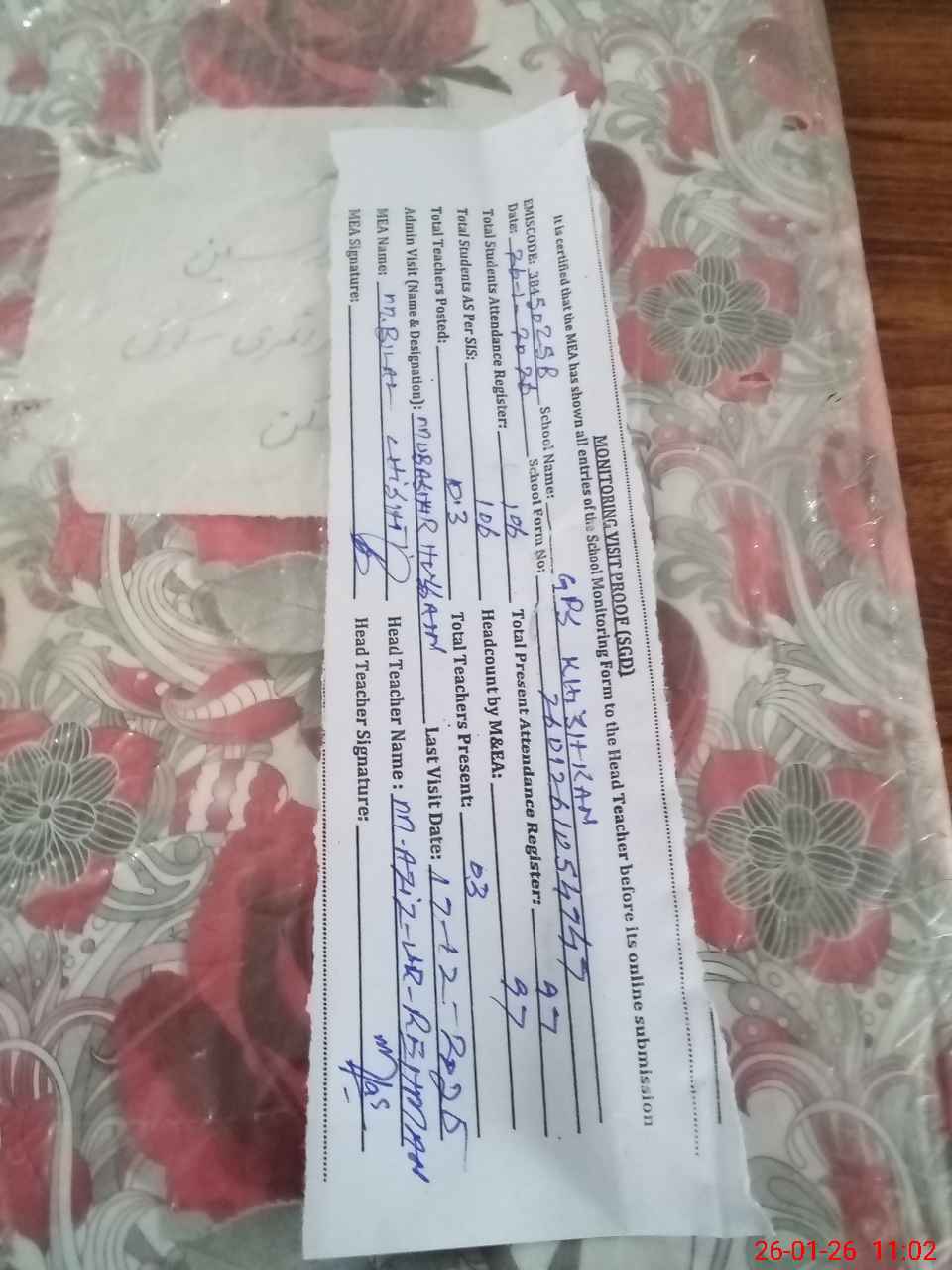 | Attendance Register | Head Teacher | MEA with School | Visit Proof |