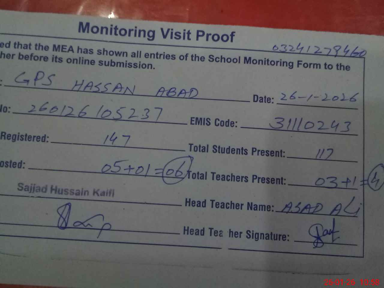 | Attendance Register | Head Teacher | MEA with School | Visit Proof |