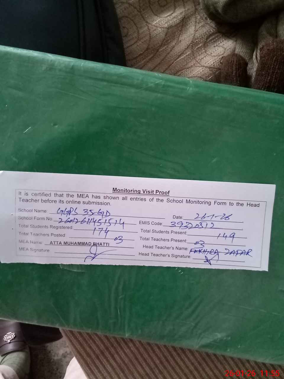 | Attendance Register | Head Teacher | MEA with School | Visit Proof |
