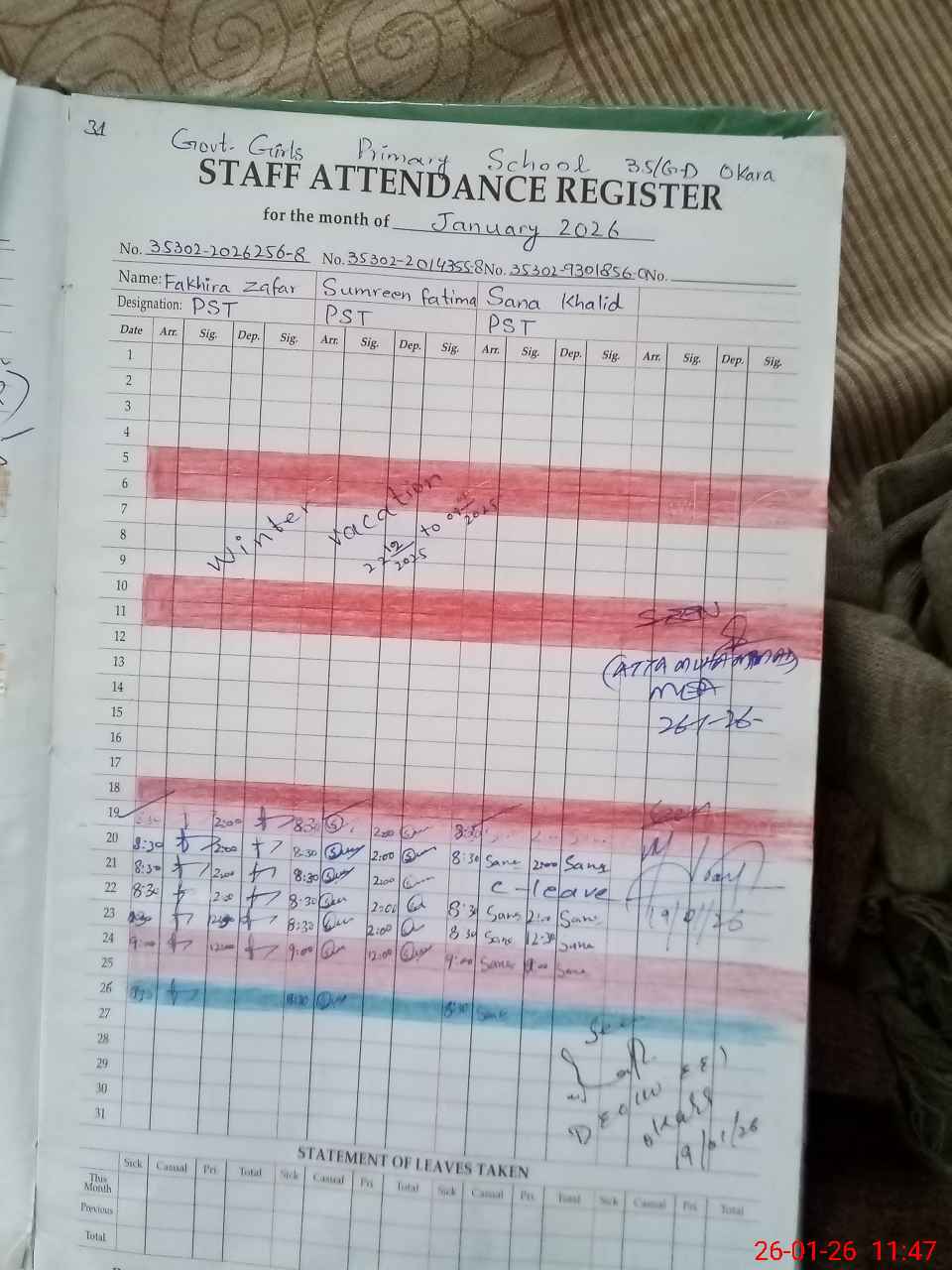 | CNIC | Full Name | Designation | R/C | Absence During Last Calender Month |
