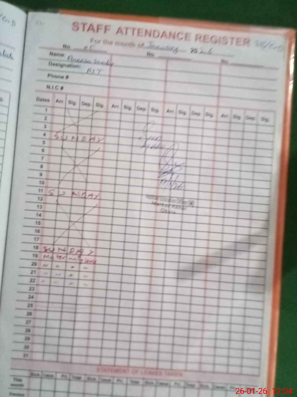 | CNIC | Full Name | Designation | R/C | Absence During Last Calender Month |