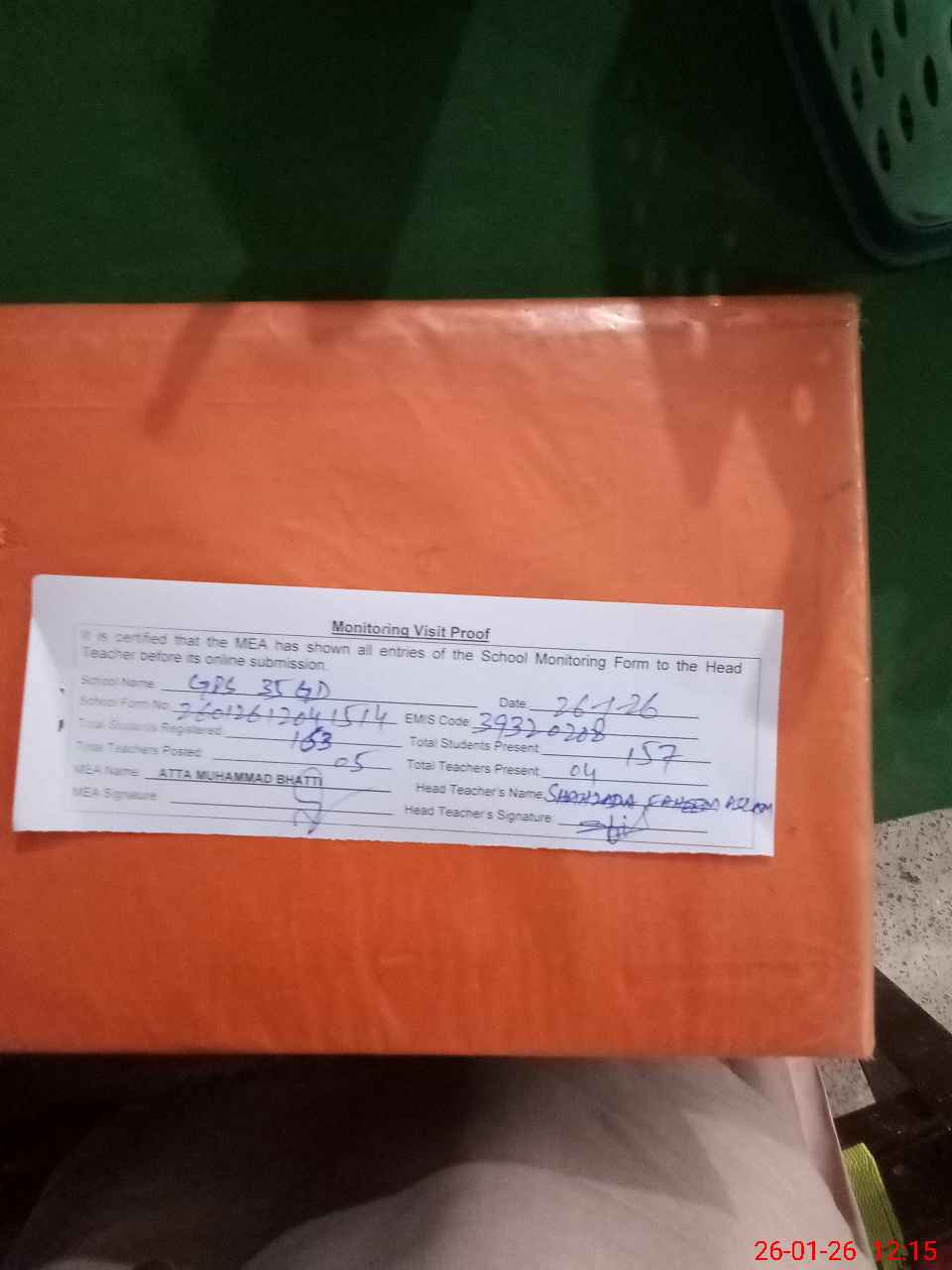 | Attendance Register | Head Teacher | MEA with School | Visit Proof |