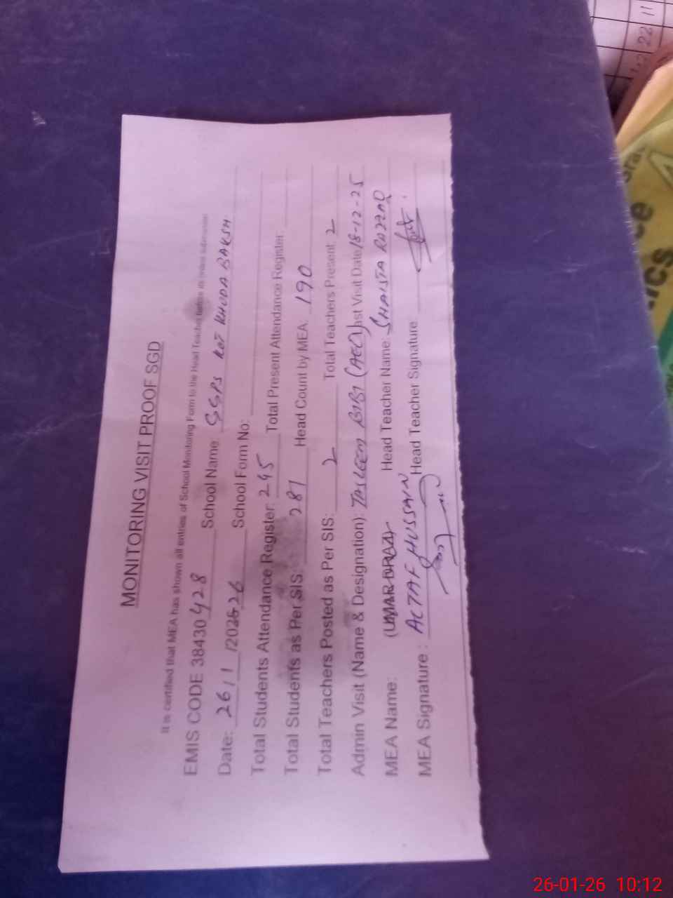| Attendance Register | Head Teacher | MEA with School | Visit Proof |