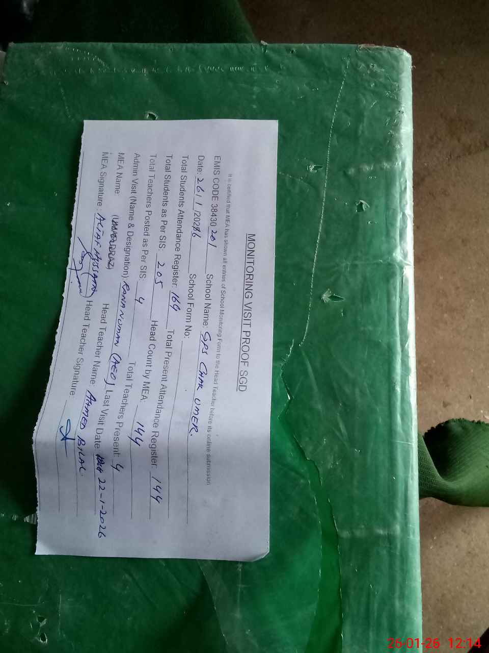 | Attendance Register | Head Teacher | MEA with School | Visit Proof |