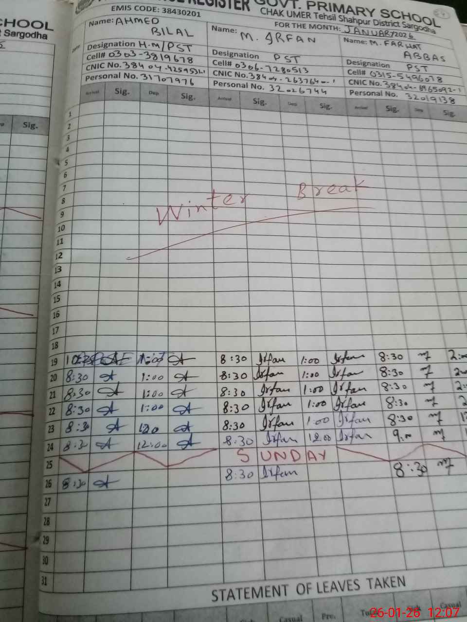 | CNIC | Full Name | Designation | R/C | Absence during last cal. month |