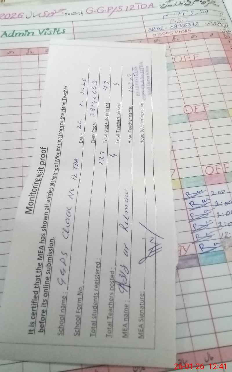 | EMIS Code: 38140643 | Name of School: GGPS CHAK NO. 12/TDA | |||