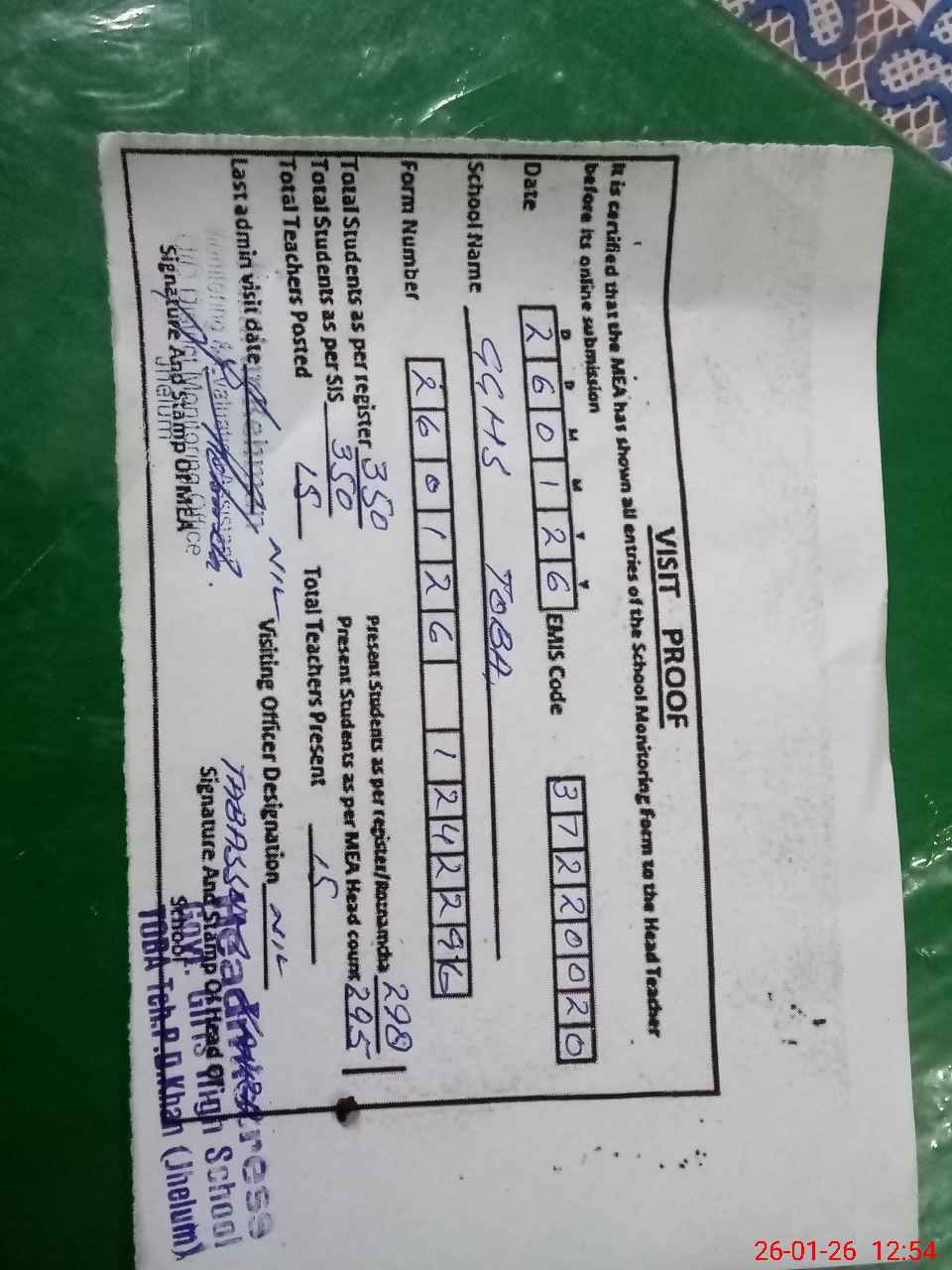 | Attendance Register | Head Teacher | MEA with School | Visit Proof |