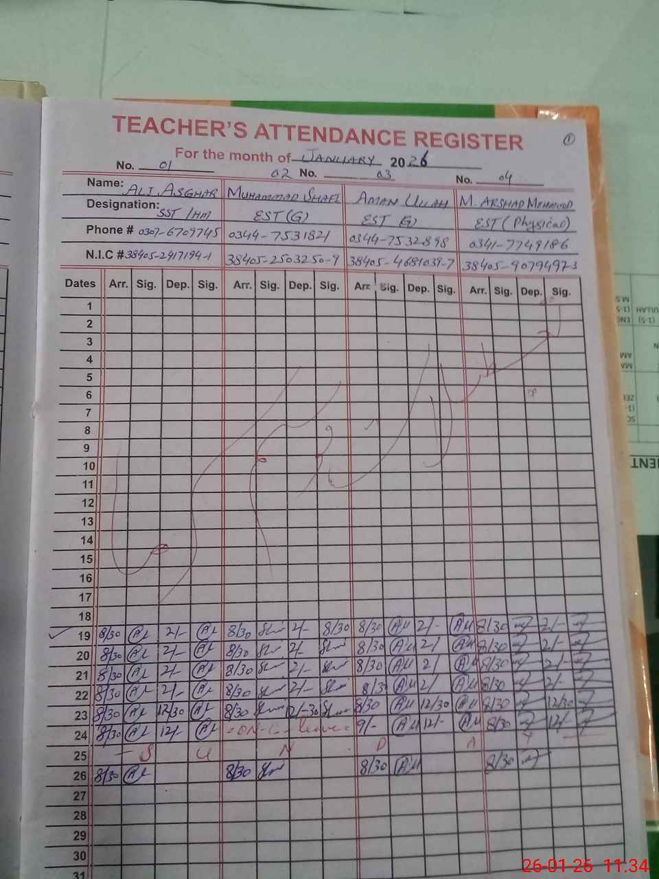 | CNIC | Full Name | Designation | R/C | Absence during last cal. month |