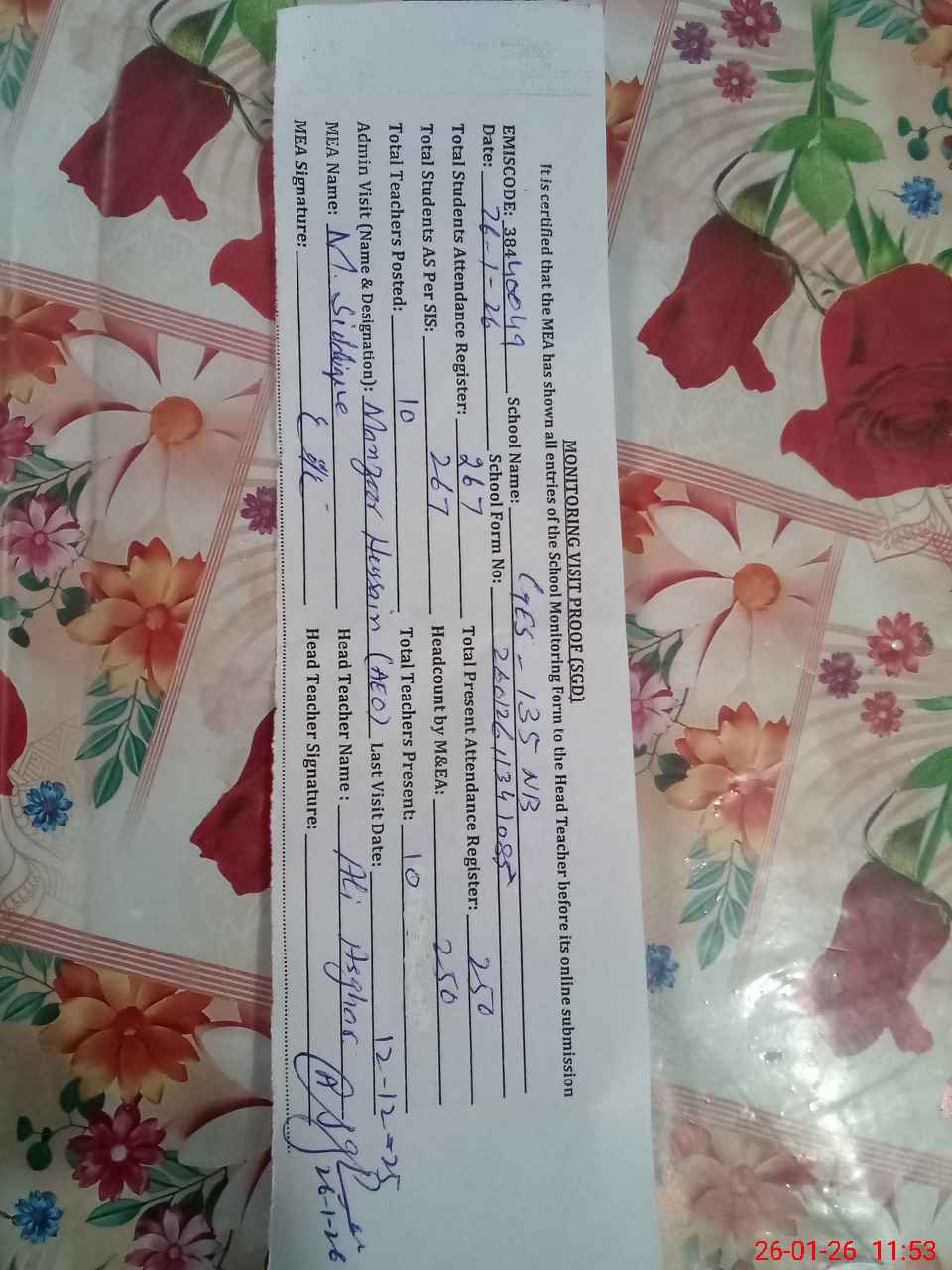 | Attendance Register | Head Teacher | MEA with School | Visit Proof |