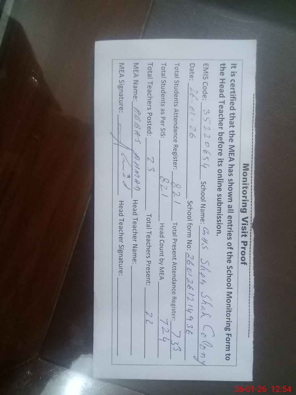 | Attendance Register | Head Teacher | MEA with School | Visit Proof |