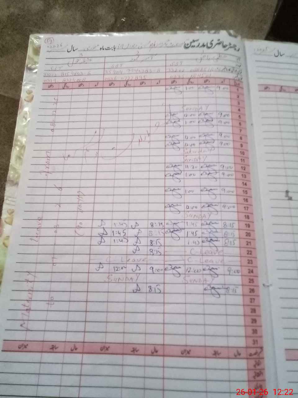 | CNIC | Full Name | Designation | R/C | Absence During Last Calender Month |