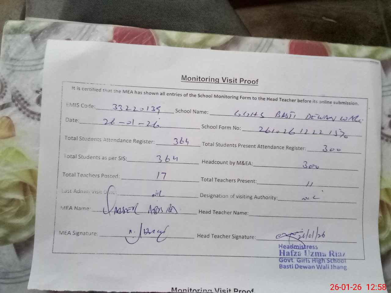 | Attendance Register | Head Teacher | MEA with School | Visit Proof |