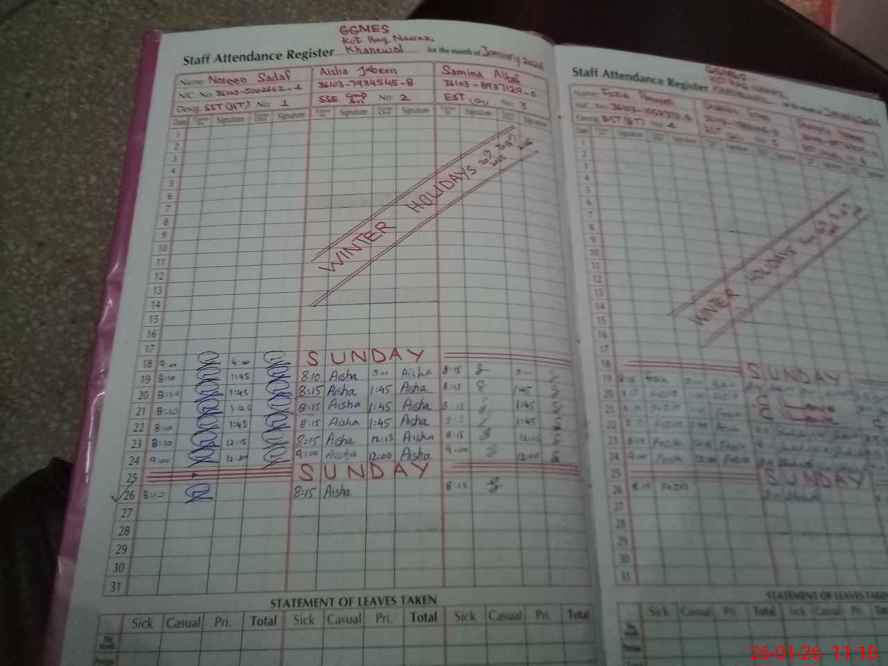 | CNIC | Full Name | Designation | R/C | Absence During Last Calender Month |