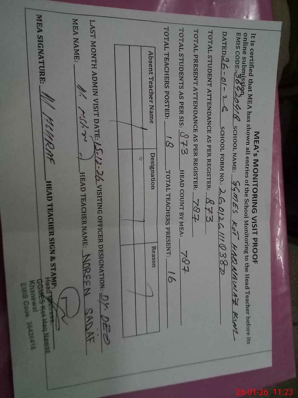 | Attendance Register | Head Teacher | MEA with School | Visit Proof |