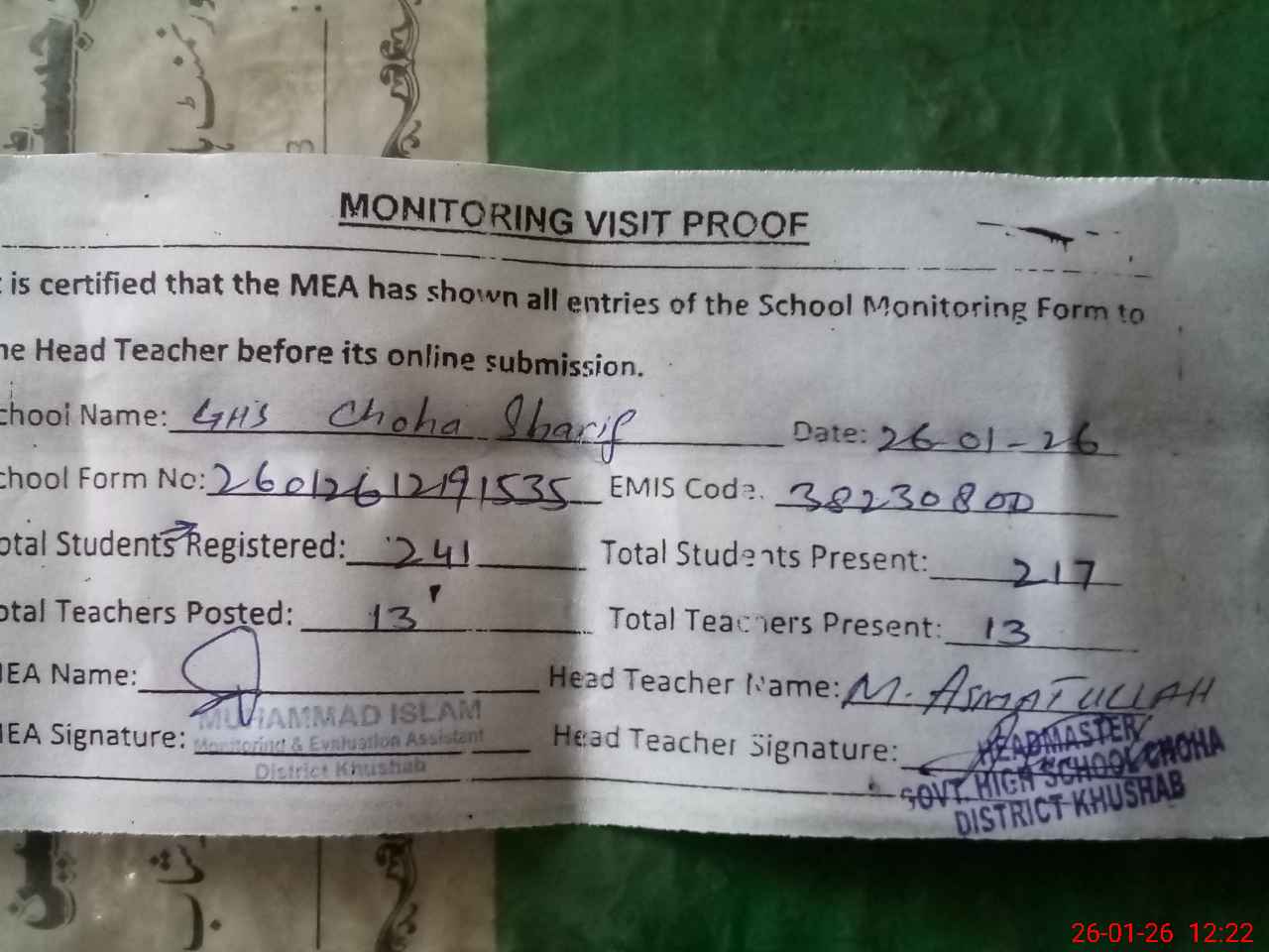| EMIS Code: 38230800 | Name of School: GHS CHOHA SHARIF | |||