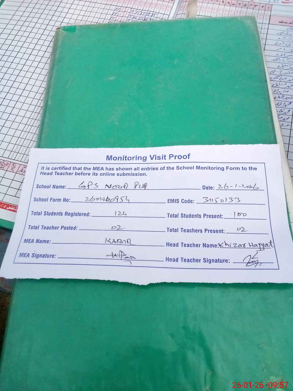 | Attendance Register | Head Teacher | MEA with School | Visit Proof |