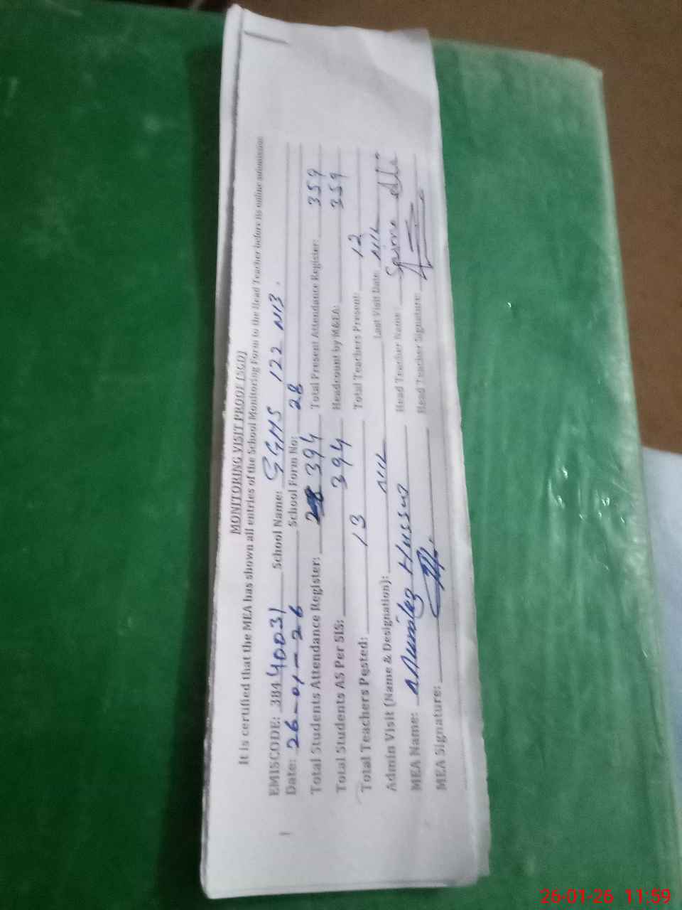 | Attendance Register | Head Teacher | MEA with School | Visit Proof |