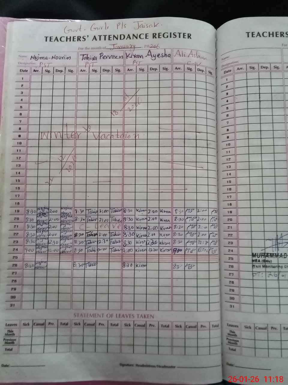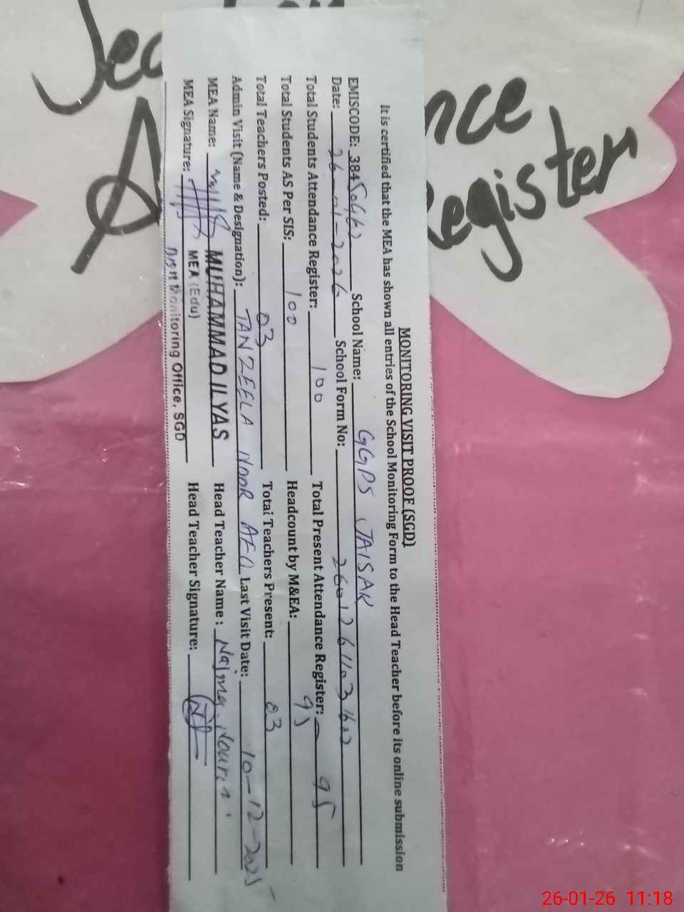 | Attendance Register | Head Teacher | MEA with School | Visit Proof |