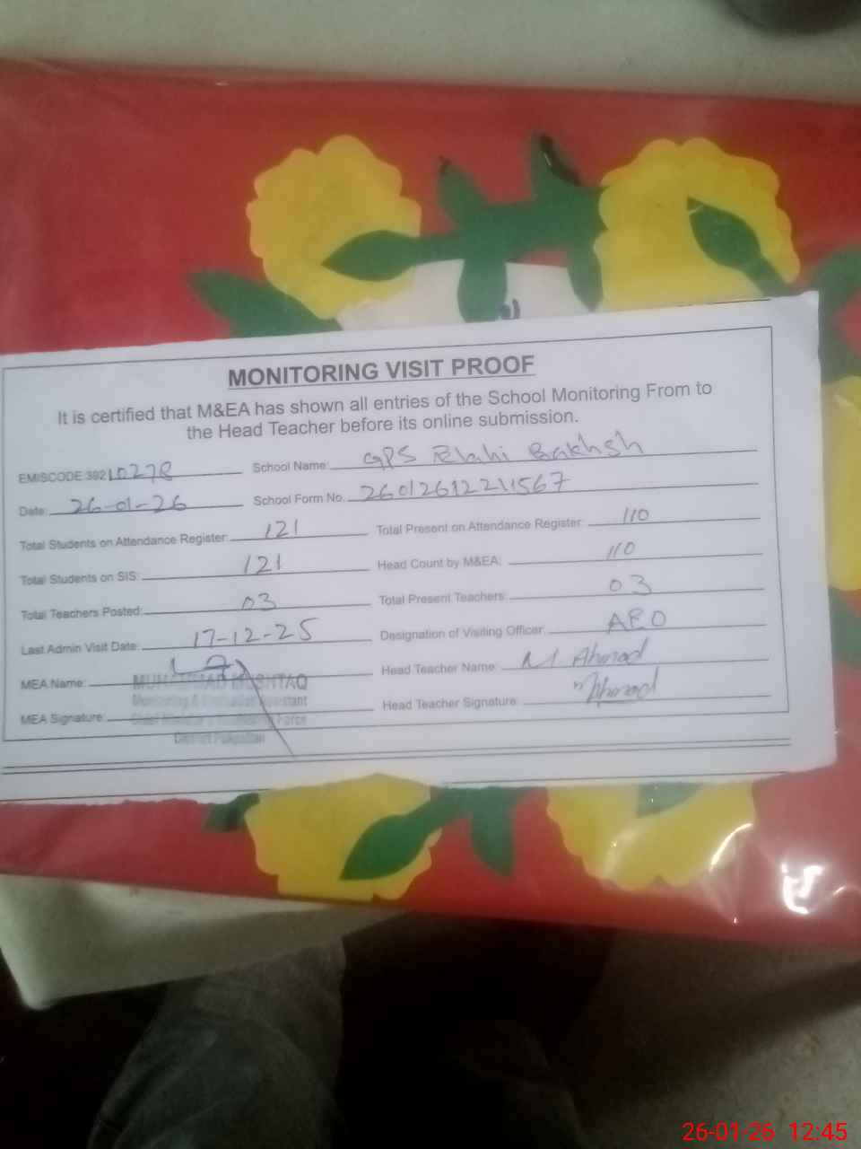 | Attendance Register | Head Teacher | MEA with School | Visit Proof |