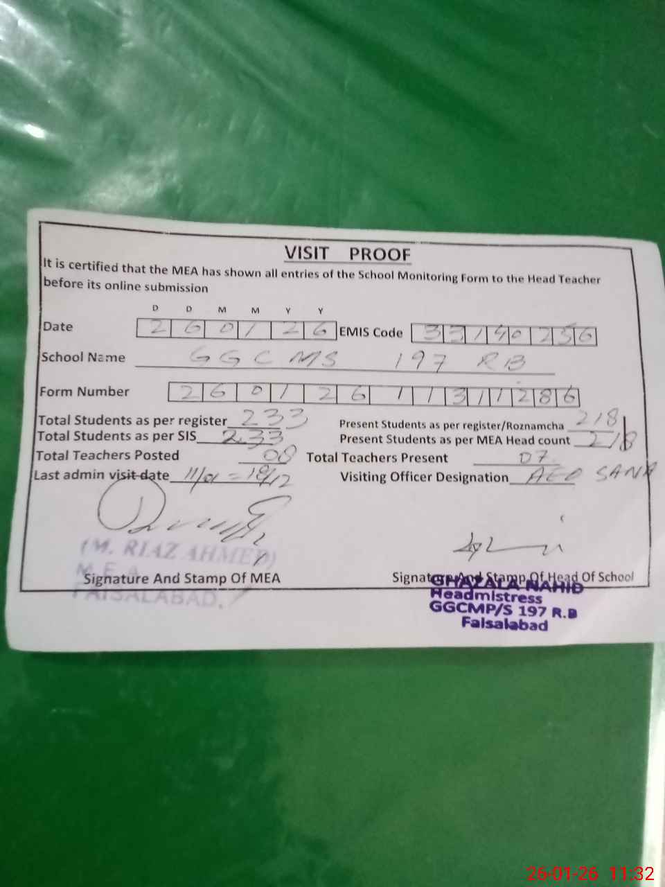 | Attendance Register | Head Teacher | MEA with School | Visit Proof |