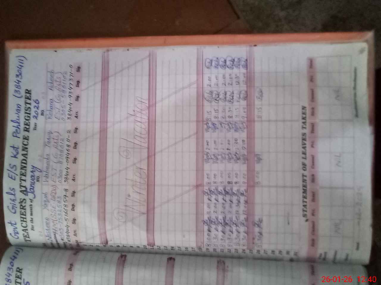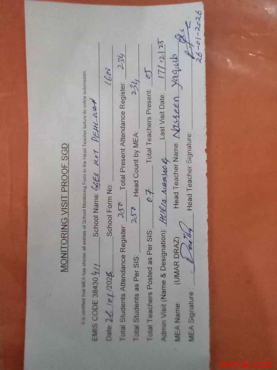 | Attendance Register | Head Teacher | MEA with School | Visit Proof |