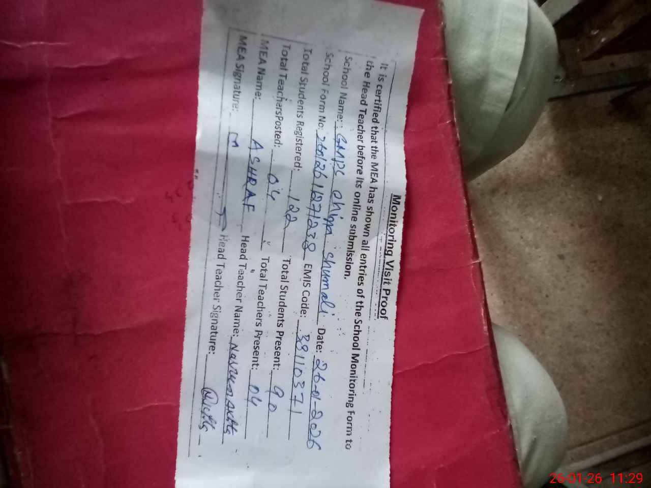 | Attendance Register | Head Teacher | MEA with School | Visit Proof |