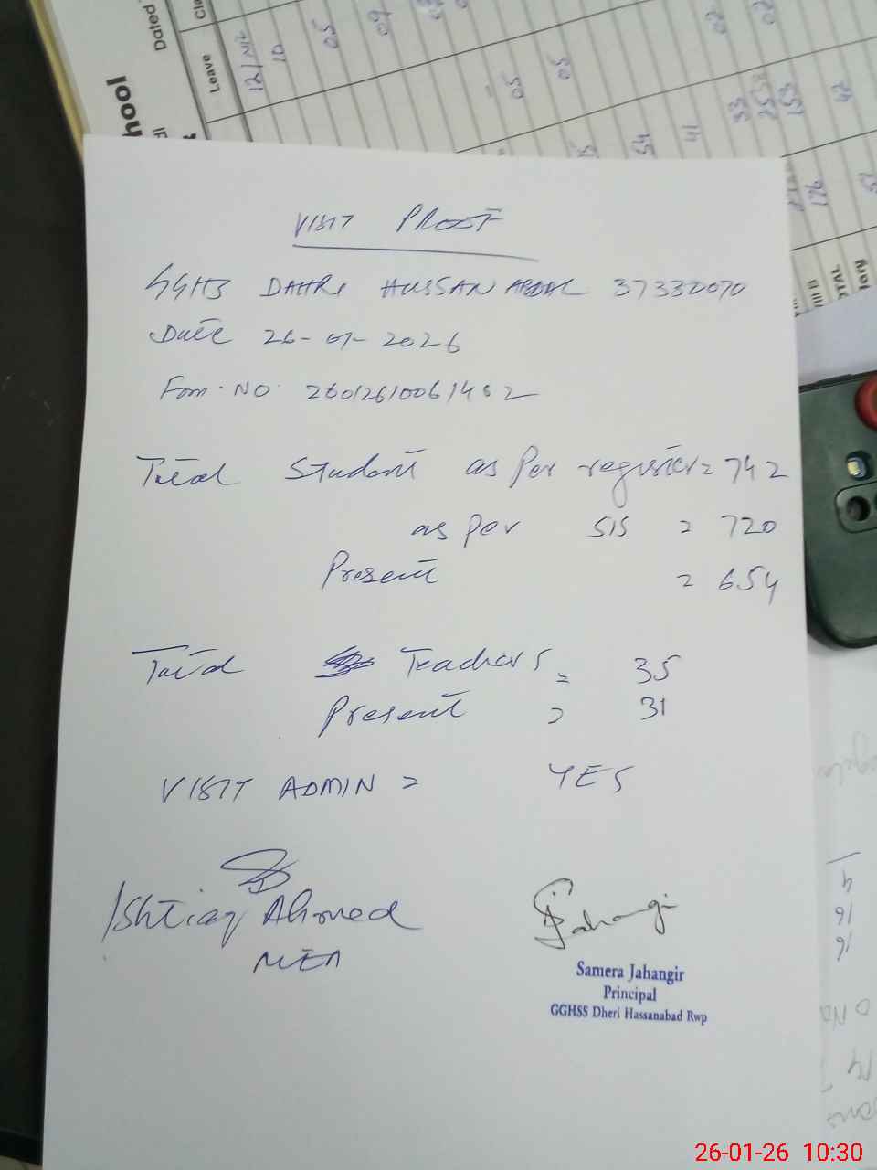 | Attendance Register | Head Teacher | MEA with School | Visit Proof |
