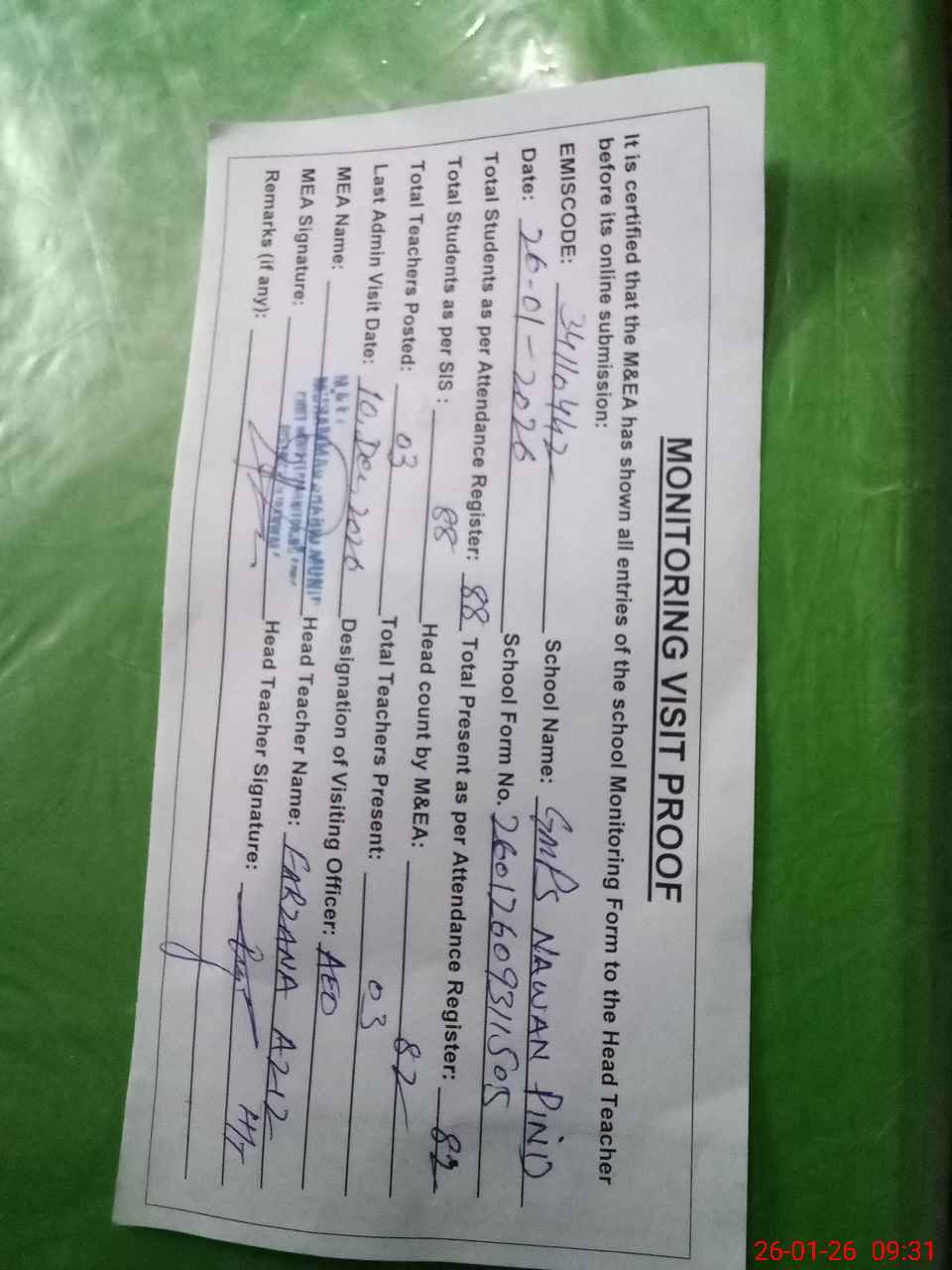| Attendance Register | Head Teacher | MEA with School | Visit Proof |
