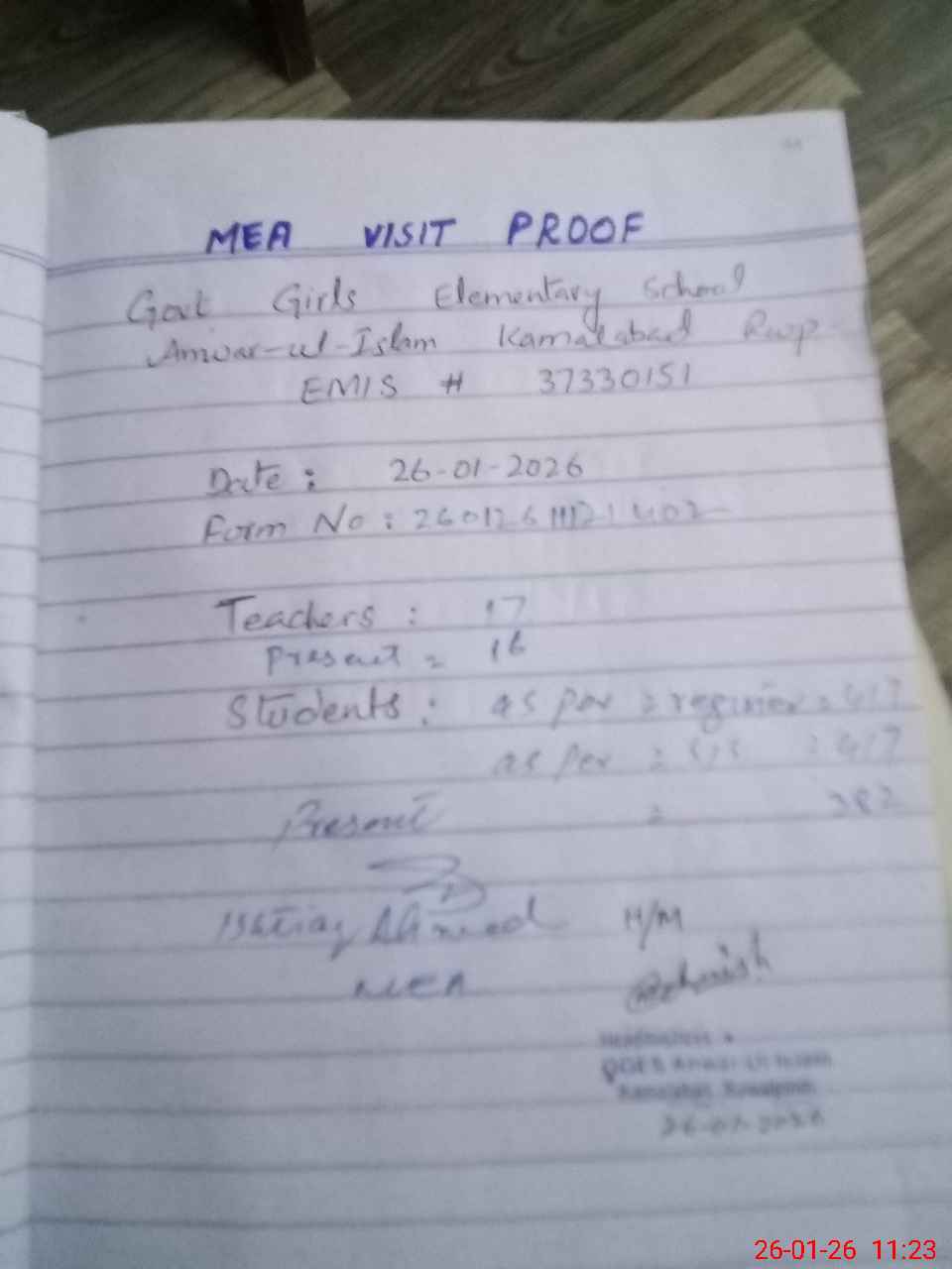 | Attendance Register | Head Teacher | MEA with School | Visit Proof |